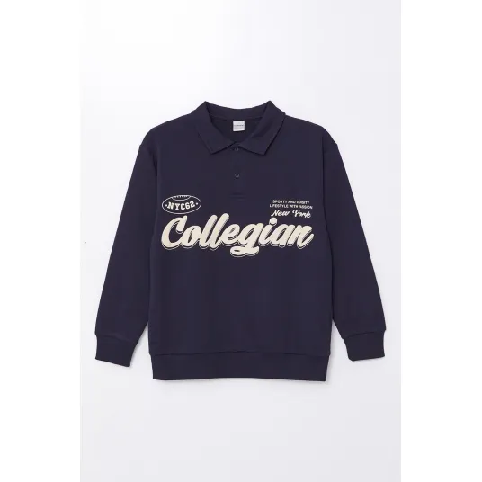 LC WAIKIKI, Bluza de trening cu model grafic si guler polo, Bej deschis, Bleumarin, 152-158 CM