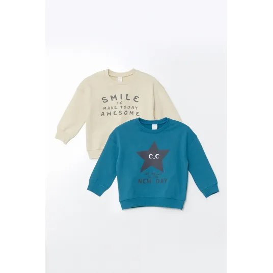 LC WAIKIKI, Set de bluze de trening cu imprimeu - 2 Piese, Bej, Albastru petrol, 74-80 CM