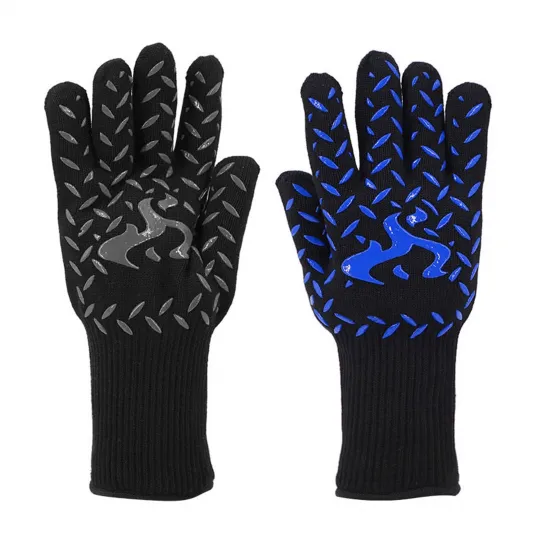 Manusi pentru gratar si bucatarie, Yhemday®, 2 pereche, rezistente la caldura, protectie anti-alunecare, aplicabil pentru exterior si bucatarie, marime universala, silicon, negru & albastru