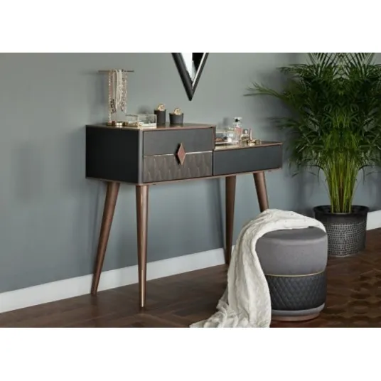 Dimensiuni exterioare: Lungime: 119,8 cm Latime: 43,8 cm Inaltime: 93,3 cm Articol: 3200376503. Colectia: Diamond Culoare: Nuc / Negru / Auriu Farmecul atemporal al pieselor de mobilier in stil glam in combinatie cu cele mai recente tendinte in design definesc colectia Diamond. Caracterul lor exceptional se evidentiaza prin eleganta si rafinamet, pemitand aranjarea unui interior in care timpul petrecut va fi de neuitat. Masa de machiaj Diamond impresioneaza prin designul glam cu linii minimaliste ce se potriveste cu usurinta in orice dormitor. Detalii tehnice: Produsul este realizat din pal si are picioarele din lemn. Masa de machiaj are 2 sertare pentru depozitare. Sertarul din dreapta are sistem de deschidere push-up. Articol: 3200376503, Colectie DIAMOND