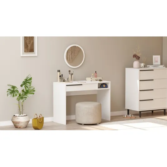 Cu designul sau elegant si modern, masa noastra de machiaj va ridica instantaneu aspectul si atmosfera spatiului dvs. Culoarea alba clara adauga o nota de rafinament, creand o atmosfera senina si linistita.