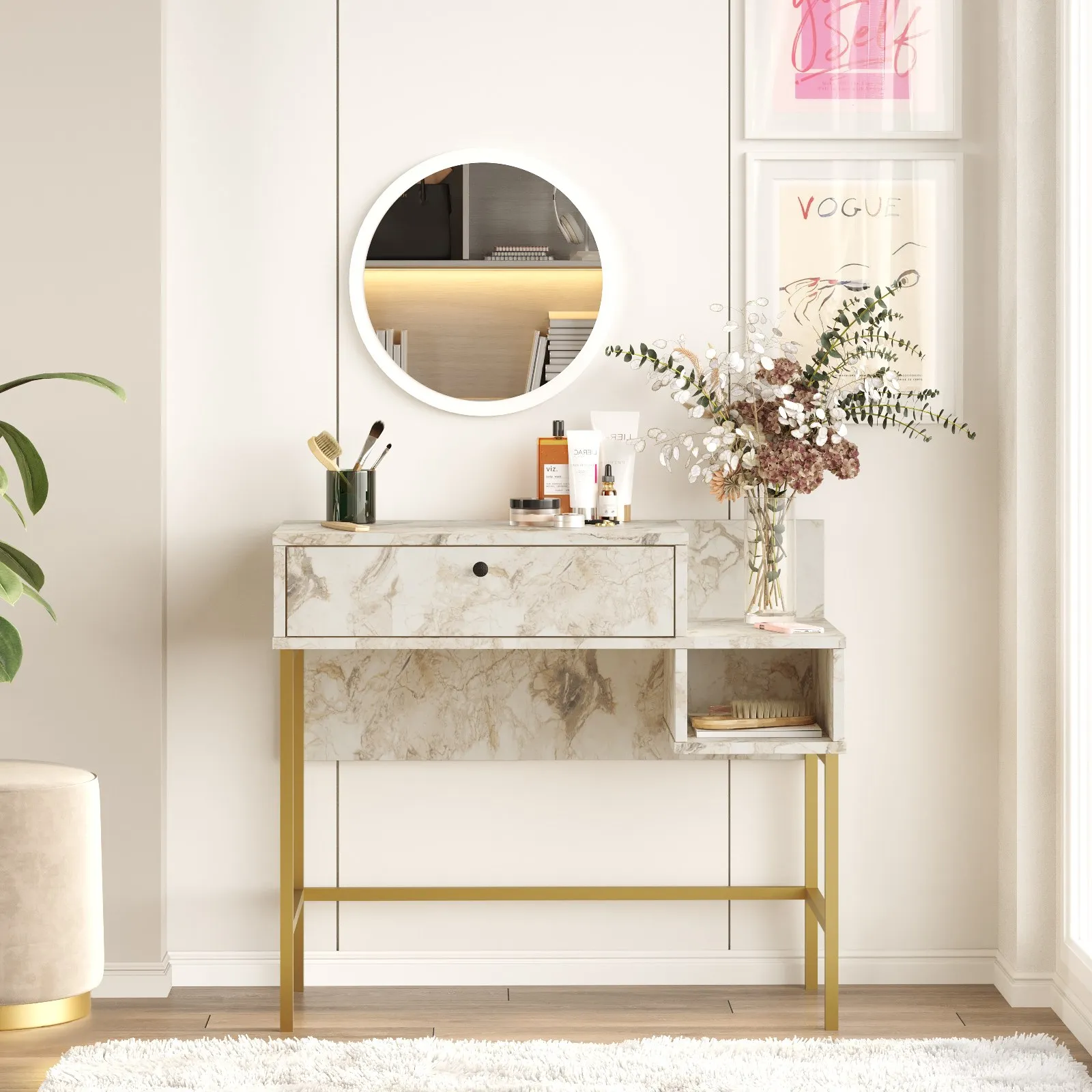 Avand o combinatie frumoasa de culori alb si auriu, masa noastra de machiaj emana rafinament si eleganta. Accentele aurii adauga o nota de farmec, facand-o o piesa de referinta in orice camera. Blatul spatios al mesei ofera un spatiu amplu pentru toate lucrurile esentiale pentru frumusete, in timp ce oglinda permite o aplicare impecabila a machiajului.