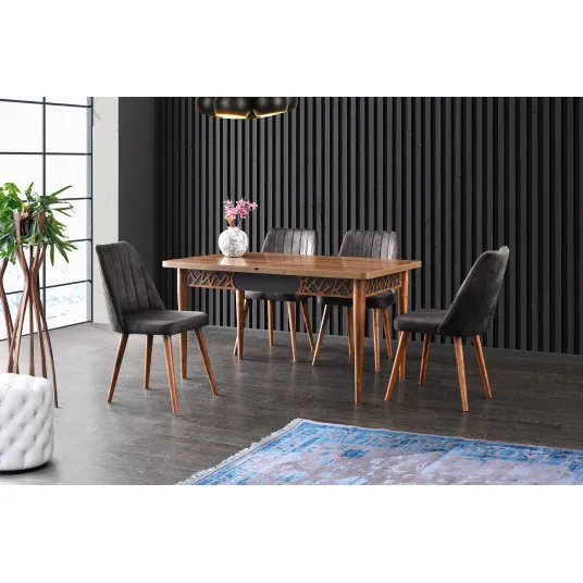 Combinatia de culori nuc si antracit confera acestei mese de luat masa un aspect contemporan si elegant. Culorile contrastante adauga profunzime si interes vizual, ceea ce o face o piesa statement in orice camera. Indiferent daca locuinta dvs. are o estetica moderna sau traditionala, aceasta masa de luat masa se va integra perfect si va va imbunatati decorul existent.