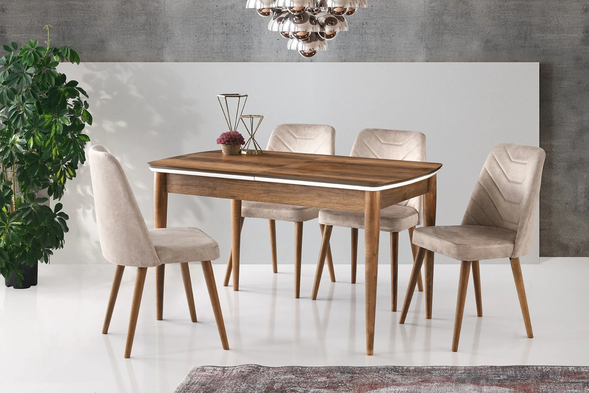 Combinatia de culori nuc si alb confera mesei noastre de luat masa un aspect contemporan si sofisticat, ceea ce o face un accesoriu perfect pentru orice decor interior. Designul sau elegant si liniile curate adauga o nota de eleganta zonei dvs. de luat masa, transformand-o instantaneu intr-un spatiu elegant si primitor.