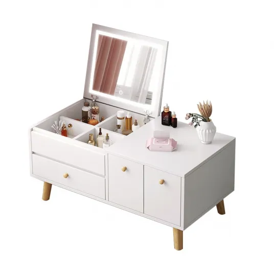 Masa de toaleta compacta, cu oglinda LED, mai multe sertare si spatii de depozitare, birou, multifunctionala,80Г—40Г—38cm, alb + lemn natur