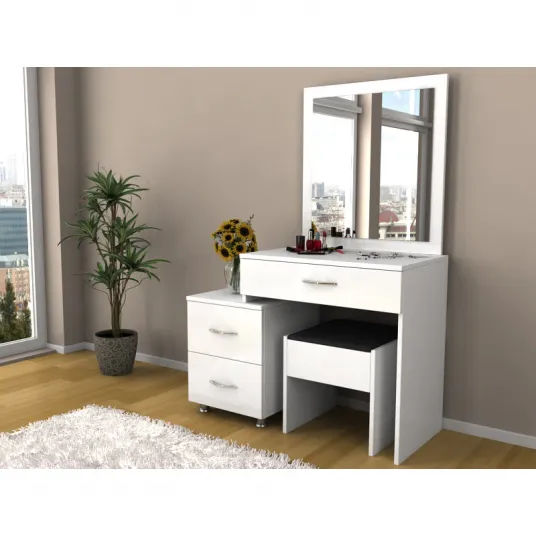 Masa de machiaj Kalune Design Nice este cheia ta pentru o rutina de infrumusetare luxoasa si eficienta. Cu designul sau elegant, caracteristicile practice si calitatea exceptionala, aceasta masa de toaleta aduce confort si stil vietii tale de zi cu zi. Este investitia perfecta pentru cei care pretuiesc atat functionalitatea, cat si estetica in spatiile lor personale.