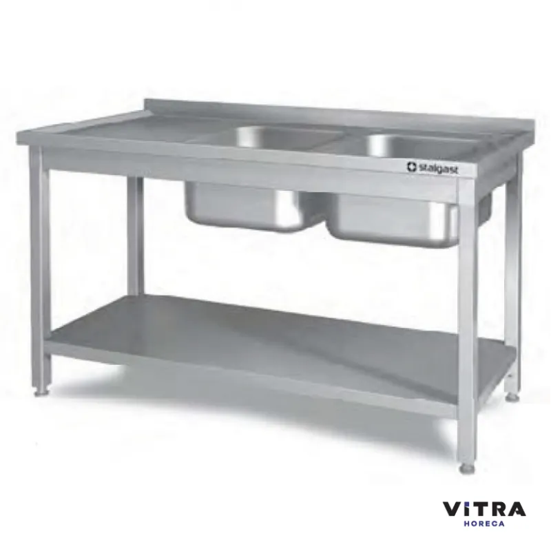 Pe langa cele doua chiuvete, aceasta masa din otel inoxidabil include si un raft de jos spatios. Acest raft ofera spatiu amplu de depozitare pentru oale, tigai si alte articole esentiale de bucatarie. Pastrati articolele cele mai utilizate la indemana, permitandu-va sa lucrati eficient si sa va pastrati bucataria ordonata in orice moment.