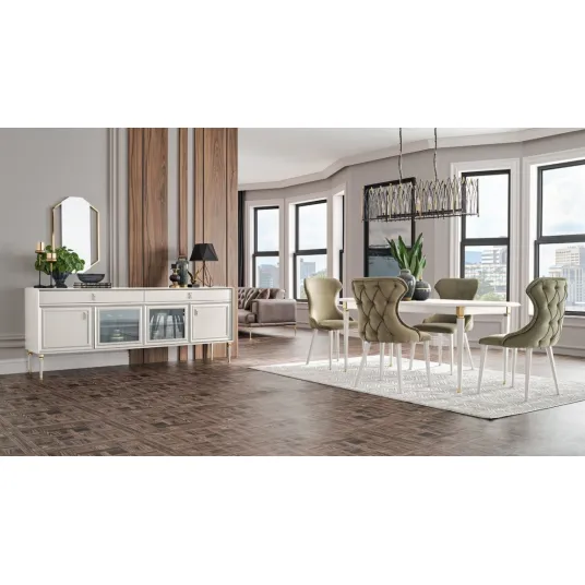 Dimensiuni: Lungime: 196,4 cm Latime: 100 cm Inaltime: 75,2 cm Articol: 3200387854. Colectia: Lorenta Jasmin Culoare: White/ Auriu Material: MDF / Pal / Poliuretan Colectia Lorenta Jasmin creaza o ambianta placuta, in care timpul petrecut va fi de neuitat. Detaliile delicate evidentiaza perfect farmecul fiecarei piese de mobilier, pemitand aranjarea unui interior elegant si modern. Masa Lorenta Jasmin se integreaza perfect in livingul dumneavoastra si creeaza un puternic efect vizual. Detalii tehnice: Produsul este realizat din MDF si pal. Picioarele sunt realizate din poliuretan. Respecta toate standardele de calitate ale UE. Se recomanda evitarea produselor dure si abrazive pe suprafata blatului. Articol: 3200387854, Colectie LORENTA JASMIN