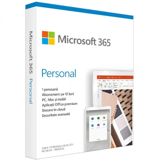 Microsoft 365 Personal, Engleza, Subscriptie 1 an, 1 PC/Mac, 1 Tableta, 1 Telefon, Windows, MacOS, iOS, AndroidIti prezentam Microsoft 365 Personal Aplicatii Office Premium, spatiu de stocare suplimentar in cloud, securitate avansata si multe altele, toate intr-un abonament convenabil. Office 365 este acum Microsoft 365. Un nou nume, mai multe beneficii, acelasi pret. Cumpara astazi si la activarea abonamentului vei obtine automat toate beneficiile Microsoft 365. Ce este inclus Un loc securizat pentru fotografiile si fisierele tale Cu abonamentul tau Microsoft 365, obtii 1 TB de spatiu de stocare in cloud pe OneDrive. Adica poti stoca 300.000 de fotografii, plus toate documentele tale, (1) pe care poti sa le accesezi, sa le editezi si sa le partajezi de pe toate dispozitivele tale, stiind deopotriva ca fisierele tale beneficiaza mereu de backup si ca sunt protejate. Ce este nou in Microsoft 365 Redacteaza cele mai bune materiale, indiferent de unde scrii Redacteaza cele mai bune materiale, indiferent de unde scrii, cu Editor Microsoft (2), asistentul tau inteligent pentru scriere. Editor ofera functii de ajutor avansate in legatura cu regulile de gramatica si ortografiere, in peste 80 de limbi. Conecteaza-te. Organizeaza. Realizeaza tot ce iti propui. Economiseste timp si concentreaza-te pe ceea ce conteaza, cu Outlook—aplicatia care te ajuta sa-ti organizezi viata. Designul simplu si inteligent te ajuta sa ramai conectat, sa-ti citesti mai rapid e-mailurile tale si sa-ti organizezi inboxul pentru a-ti simplifica viata. Stimuleaza-ti creativitatea Realizeaza mai multe si stimuleaza-ti creativitatea prin accesul la un catalog din ce in ce mai voluminos de sabloane premium pentru Word, Excel si PowerPoint. Alege dintr-o selectie generoasa de fotografii impresionante, pictograme, fonturi, modele 3D si multe altele, pentru a aduce expresivitate in munca ta. Descatuseaza-ti imaginatia Creeaza continut personalizat de inalta calitate, care se potriveste stilului tau unic. Cu abonamentul Microsoft 365, poti alege dintr-o colectie tot mai mare de fotografii de calitate profesionala, ilustratii bazate pe vectori, clipuri video in bucla, fonturi si pictograme, care te ajuta sa mentii proiectele actuale si atragatoare. Protejeaza tot ce este mai important Efectuarea backupului pentru fisierele de pe PC s-a simplificat Cu backupul pentru foldere OneDrive pe PC, poti sa faci backup pentru folderele Documente si Imagini de pe PC-ul tau Windows pe OneDrive, pentru ca acestea sa fie mereu protejate, actualizate si disponibile pe toate dispozitivele tale. Protectia devine personala Seif personal este un folder protejat din cadrul OneDrive care poate fi accesat prin doua etape de verificare a identitatii. Acesta iti ofera un nivel suplimentar de protectie pentru cele mai importante fisiere. Se presupune ca fotografiile sunt fisiere JPG de 4 MB, iar documentele sunt fisiere Office de 0,8 MB Disponibil ca extensie pentru browserele Microsoft Edge sau Chrome, necesita un cont Microsoft701410899701410899