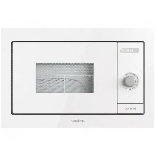 Микроволновая печь Gorenje BM 235 SYW в классическом белом цвете с лаконичным дизайном претом преском ерьер кухни.