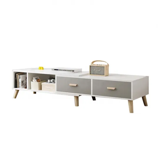 Mobilier living, comoda TV, masuta de cafea, 2 sertare, lungime reglabila, picioare din lemn masiv, (120-198)Г—30Г—40cm, alb + gri
