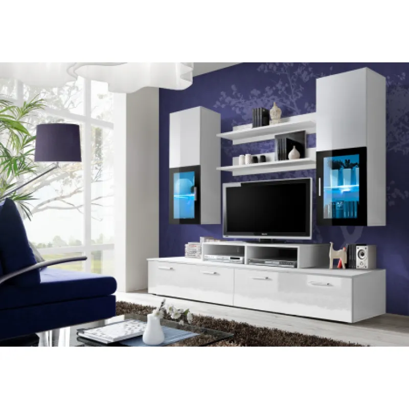 Living fabricat din pal melaminat si mdf 16 mm grosime , canturi abs, culoare alb lucios la fatada si carcasa pal alb mat. 200 cm lungime x 190 cm inaltime x 45 cm adancime(corpurile de jos) cu vitrina, sticla neagra lumina led Calitate si design unicat ! Atentie ! Decoratiunile din imagini nu sunt incluse in pret , sunt doar pentru decor ! Se livreaza neasamblat, in colete . Coletele contin tot ce este necesar pentru asamblare (schita, accesorii , feronerie. )