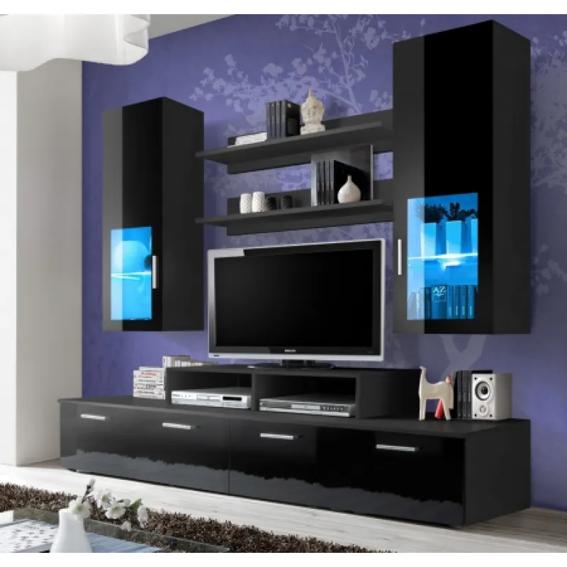 Living fabricat din pal melaminat , si placa laminata 16 mm grosime , canturi abs, culoare usi negru lucios sticla neagra -carcasa negru 200 cm lungime x 190 cm inaltime x 45 cm adancime(corpurile de jos) cu vitrina, sticla neagra lumina led Calitate si design unicat ! Atentie ! Decoratiunile din imagini nu sunt incluse in pret , sunt doar pentru decor ! Se livreaza neasamblat, in colete . Coletele contin tot ce este necesar pentru asamblare (schita, accesorii , feronerie. )
