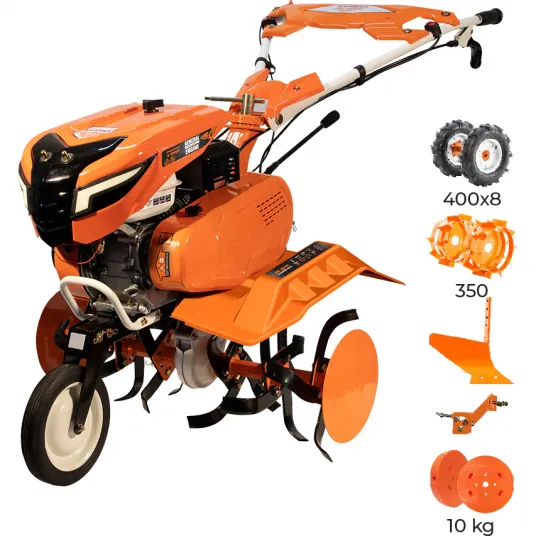 Motocultor Ruris 75002022acc4, 7 CP, 208 CC, 4 timpi, pornire manuala, 3 viteze, 560-830 mm latime lucru, 3 l benzina, roti cauciuc, plug, adaptor, roti metalice 350 fara manicot, set contragreutati
