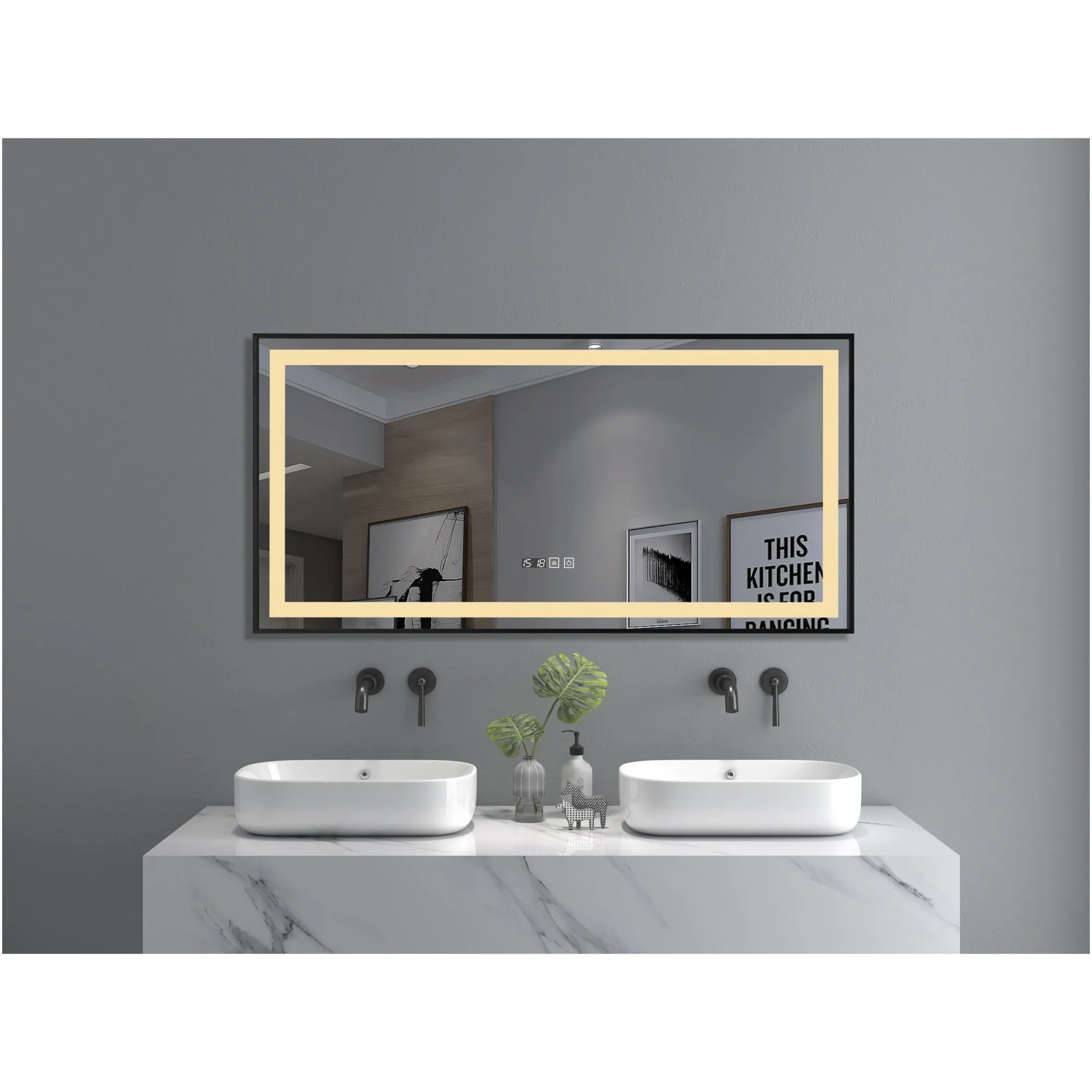 Oglinda baie Belform Infinity, cu iluminare LED 3 culori, intrerupator touch, ceas, functie dezaburire, 120x60 cm, rama aluminiu neagra