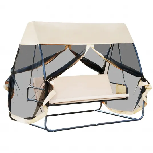 Vuoi rilassarti in giardino? Allora non puoi perdere questo fantastico dondolo letto da 3 posti, l'accessorio irrinunciabile per passare l’estate all'aperto. Grazie alla sua struttura innovativa, lo trasformi in un comodo letto ribaltando lo schienale. La struttura ha zanzariera che ti protegge dagli insetti e ti offre una buona circolazione dell’aria.