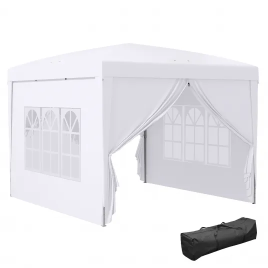 Outsunny Cort impermeabil 3x3 m pentru gradina, cort cu panouri laterale pliabile din otel si copertina din material Oxford, albCortul nostru pentru gradina Outsunny este ideal pentru orice eveniment in aer liber. Acesta ofera umbra si un mediu confortabil. Datorita structurii sale pliabile, cortul va fi gata in cel mai scurt timp si dispune de un suport din tevi de otel si o copertina impermeabila din material Oxford rezistent la razele UV. Structura dispune, de asemenea, de 4 panouri laterale, dintre care 2 cu deschidere cu fermoar si 2 cu ferestre.222848322222848322