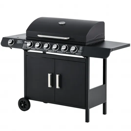 Outsunny Gratar pe Gaz cu Capac, 7 Arzatoare de 20 kW in total si Arzator Lateral, Termometru, Raft si 2 Roti, 135x50x100cm Negru