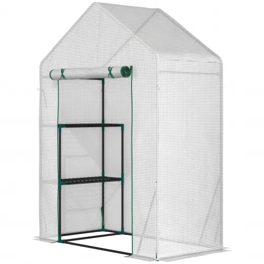 Outsunny Sera pentru Gradina pentru Exterior cu 2 Rafturi, Usa tip Rulou, 143x73x195cm, Alb