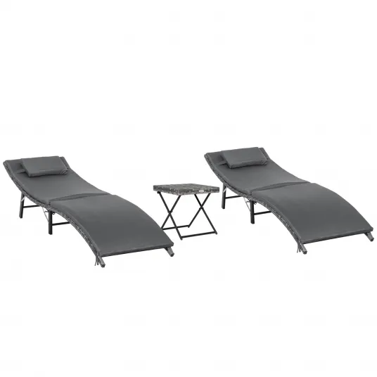 Outsunny Set de 2 Sezlonguri Pliabile, Sezlong de Gradina din Ratan cu Perne Detasabile Lavabile si Masa Pliabila, Gri