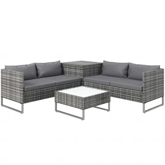 Outsunny Set de Gradina 4 Bucati cu 2 Canapele 2 Locuri, Masuta de Cafea si Masuta Inalta cu Lada, Set Masute si Scaune de Gradina din Otel si Ratan Gri si ArgintiuAcest set de gradina Outsunny este format din 4 piese pentru a va imbogati spatiul exterior. Setul este format dintr-un cadru metalic cu acoperire din ratan sintetic si un blat de masa din sticla securizata. Include 2 canapele cu 2 locuri, o masuta de cafea si o masuta inalta care actioneaza ca o legatura intre canapele si are un sertar de depozitare dedesubt.222847208222847208