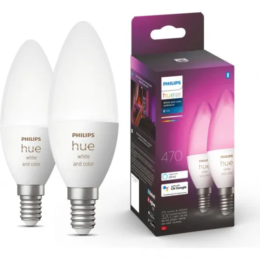 Pachet 2 becuri LED RGB inteligente Philips Hue B39, Bluetooth, Zigbee, E14, 4W (25W), 470 lm, lumina alba si color