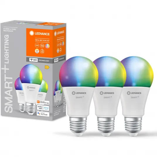 Pachet 3 becuri LED RGBW inteligente LEDVANCE Smart, WI-FI, A75, E27, 9.5W (75W), 1055 lm, dimabil, lumina alba si colorata, compatibil amazon alexa/Google Assistant, clasa energetica E