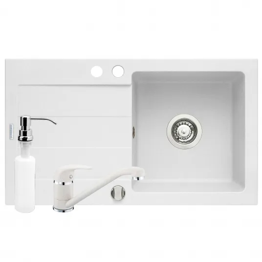 Pachet 3in1 chiuveta granit Pyramis Cristal + Baterie + Dozator detergent lichid, 760x440mm, adancime 170mm, montare pe blat, cuva dreapta, Alb