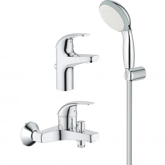 Pachet baterii Grohe Start Curve: baterie cada + baterie lavoar + para de dus cu suport, cartus ceramic, 1/2", diverter, crom