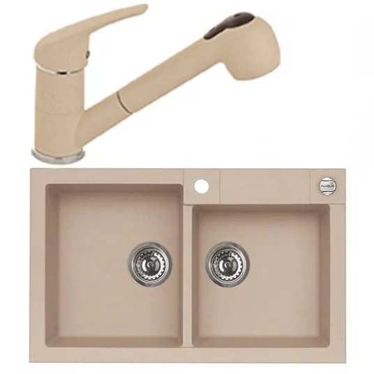 Pachet chiuveta bucatarie Algranit Alveus Rock 90 A55 + baterie cu dus extractibil AM 20, 2 cuve, 790x500mm, Bej