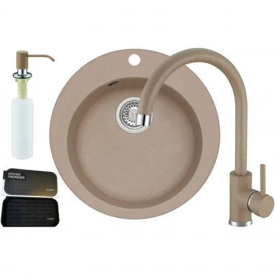 Pachet chiuveta bucatarie Alveus Victoria 10 + baterie Alveus Kati + dozator detergent lichid + organizator, adancime cuva 19cm, diametru 50.5 cm, bej