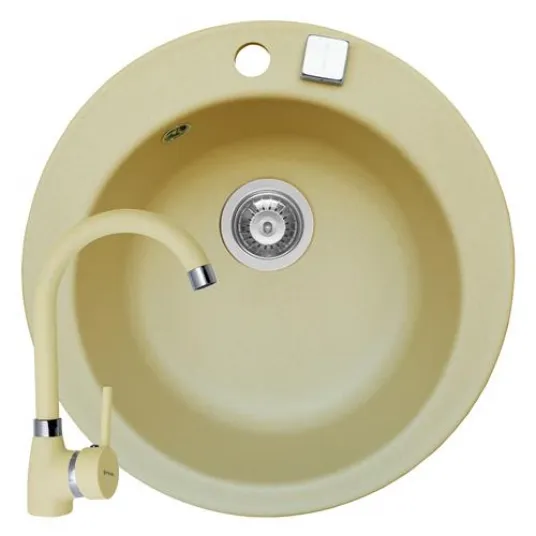 Pachet chiuveta granit + Baterie bucatarie Pyramis Bello Round, 1 cuva, 490mm, adancime 170mm, montare pe blat, Crem