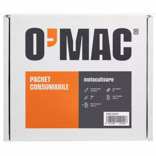 Pachet consumabile pentru motosapa/motocultor O-Mac,contine: tub vaselina 150 ml, bujie 4T, snur starter 4T, 3 X ulei transmisie 1L, ulei motor 4 timpi SAE30 1L