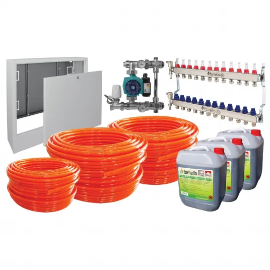 Pachet incalzire prin pardoseala Fornello, 120 mp, Teava PE-RT, Distribuitor-Colector, Grup de amestec fara pompa, Niplu redus 1-1/4'' - 1'', Pompa de recirculare, Cutie distribuitor, Aditiv sapa