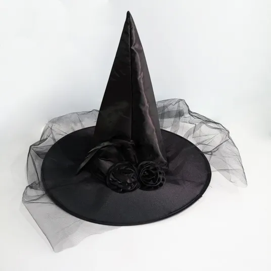 Palarie de Vrajitoare Sunmostar, Halloween, Satin cu Voal si Flori, Negru, 36x41.5cm