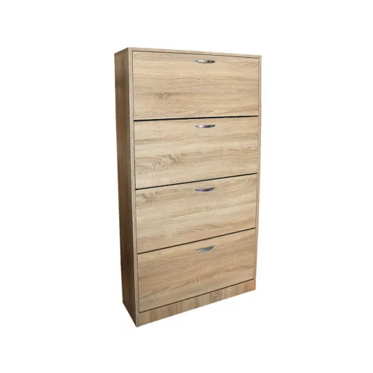 Descriere: Pantofar cu 4 usi mare sonoma, cu cate 2 randuri de depozitare a pantofilor pe fiecare usa, suporti metalici pentru o rezistenta sporita la uzura in timp, fabricat din PAL melaminat cu grosimea 16 mm, laterale si copac cantuite cu cant ABS cu grosimea de 2 mm pentru o rezistenta sporita la lovituri, PAL melaminat cu grosimea de 8 mm in interiorul spatiilor de depozitare pentru a se evita zgarierea pantofilor, maner din plastic cu filet metalic, picioruse din plastic la baza pantofarului cu rol de protectie impotriva zgarierii pardoselilor.
