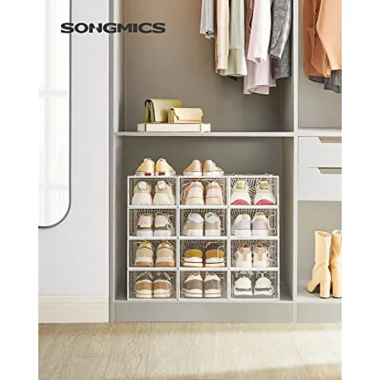 Pantofar din plastic, Songmics, Alb, 23×33.5×14 cm[Cutii de pantofi transparente] Complet transparente - trebuie doar sa te uiti la cutii pentru a gasi perechea potrivita. Astfel, nu mai trebuie sa va cautati zilnic pantofii in cutii de pantofi opace.<br><br>[Gauri de ventilatie in forma de frunze] Panoul din spate al organizatorului de pantofi este echipat cu gauri in forma de frunze care nu numai ca dau organizatorului un stil modern, dar permit si o buna circulatie a aerului pentru a evita mirosurile neplacute.<br><br>[Stabil si economie de spatiu] Materialul PET de inalta calitate combinat cu cadrul ABS cu design decupaj face ca cutiile de pantofi sa fie stabile chiar si atunci cand sunt stivuite. Profitati la maxim de spatiul dvs. si puneti-va in evidenta pantofii dvs.<br><br>[Set de 12] 12 cutii de plastic usor de emblematizat, fiecare cu o dimensiune interioara de 30 x 22,6 x 13,5 cm pentru pantofi pana la marimea 44 si va ajuta sa eliminati haosul in cel mai scurt timp! Pantofi de sport, papuci si pantofi cu toc inalt - toate in ordine<br><br>[Utilizati-le ca cutii de pantofi stivuibile in dressing, dormitor, hol sau pentru depozitarea hainelor si accesoriilor. De asemenea, puteti utiliza cutiile transparente pentru a expune obiecte decorative frumoase224186962224186962