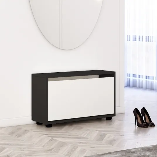 Dulap cu 1 usa, interior compartimentat in 2 zone, potrivit p/u 6 perechi incaltaminte. Corp si usi din PAL 16 mm, mecanism deschidere Mesan (Turcia), picioare plastic. Mod livrare: neasamblat, ambalat in cutii cartonate.