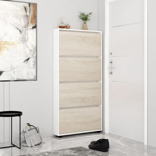 Dulap cu 4 usi, potrivit p/u 8 perechi incaltaminte. Corp si usi din PAL 16 mm, mecanism deschidere Mesan (Turcia), picioare plastic. Mod livrare: neasamblat, ambalat in cutii cartonate.