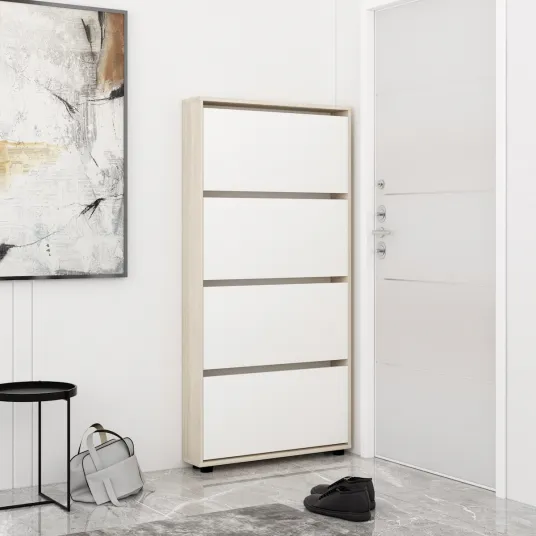 Dulap cu 4 usi, potrivit p/u 12 perechi incaltaminte. Corp si usi din PAL 16 mm, mecanism deschidere Mesan (Turcia), picioare plastic. Mod livrare: neasamblat, ambalat in cutii cartonate.