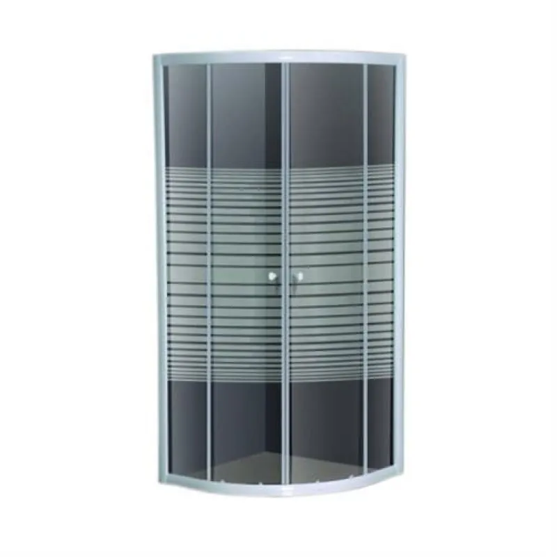 Paravan semirotund cu dimensiunile 90x90x185cm. Sticla este securizata, model cu dungi orizontale pe centru (grid) si are grosimea de 5mm. Profilul este din aluminiu, este alb si este foarte generos oferind sticlei o stabilitate foarte buna. Cabina este compusa din 2 pereti imobili si 2 usi culisante. Se poate monta atat pe cadita cat si pe pardoseala.