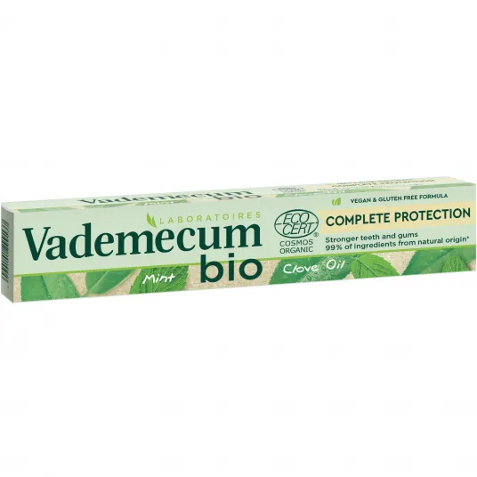 Pasta de dinti bio Vademecum Complete Protection, 75 mlPasta de dinti Vademecum Bio Complete Protection, cu extract de ceai verde organic si gust dulce de menta, a fost dezvoltata pentru:a intari dintii si protejeaza gingiile;a oferi o senzatie placuta de prospetime.Formula vegana si fara gluten.Vademecum vrea sa va inspire o atitudine pozitiva si sanatoasa pentru o viata traita aproape de natura. Avem peste 120 de ani de experienta. Combinam cu succes tehnologia de ultima generatie cu puterea extractelor de plante pentru a crea cele mai bune variante de tratament zilnic in ingrijirea orala, cu ingrediente si minerale sanatoase, in completa armonie cu natura. Formulele noastre eficiente contin peste 90% ingrediente naturale fiind concepute si testate de experti stomatologi.