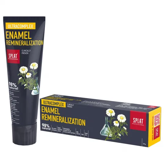 Pasta de dinti SPLAT ULTRACOMPLEX pentru reminelarizarea smaltului, 125 g Pasta de dinti bio-activa, pentru remineralizarea smaltului cu fluoruri Produs cu fluor.SPLAT Professional New ULTRACOMPLEX contine 98% ingrediente naturale si 1428 ppm fluor pentru restaurarea complexa si remineralizarea smaltului dintilor. Pasta este potrivita si pentru cei care se lupta cu sensibilitatea dintilor deoarece, datorita ionilor de potasiu si zinc, calmeaza gingiile si reduce sensibilitatea dintilor.Beneficii:Reducerea sensibilitatii si remineralizarea smaltului --> Hidroxiapatita cu calciu/magneziu/zinc, lactat de calciuRespiratie proaspata --> Uleiuri esentiale de coaja de grepfrut, menta, lamaita, citrat de zincEfect de albire --> Sistem inovator Bio Sp.White System®, polifosfat de sodiu Descriere produs:Pasta de dinti bio-activa SPLAT® PROFESSIONAL ULTRACOMPLEX pentru remineralizarea smaltului. CU FLUORURI. Enzimele naturale desfac placa dentara din locurile greu accesibile. Calciul activ si sistemul inovator BIO Sp.White System® (hidroxiapatita cu calciu/magneziu/zinc, bromelaina, siliciu, lizati, polifosfat de sodiu) lustruiesc smaltul, contribuie la intarirea dintilor si ajuta la sanatatea si ingrijirea orala. Hidroxiapatita cu calciu/magneziu/zinc reduce hipersensibilitatea. Uleiurile esentiale de lamaie, menta si lamaita improspateaza respiratia. Extractul de ienupar si bisabololul au un efect calmant asupra gingiilor. Ionii de potasiu reduc sensibilitatea smaltului, in timp ce ionii de zinc au un efect calmant asupra gingiilor. Monofluorofosfatul de sodiu protejeaza impotriva cariilor.Produs cu un continut de fluor de– 0,14 % (1 428 ppm). 98% NATURAL. Certificare HalalProdus cu un continut de fluor de 1428 ppmDaca suplimentati cu fluor din alte surse, consultati medicul sau medicul dentist. SPLAT Professional New ULTRACOMPLEX contine 8 ingrediente active naturale. Aceste ingrediente active ajuta la reducerea sensibilitatii si albirea blanda a smaltului dintilor. Nu contine:SLES, clorhexidina, PEG, alcool, zaharina, coloranti si arome artificiale, uleiuri minerale. Utilizare:Recomandam periajul dintilor de 2 ori pe zi, dupa mese. Pentru un efect maxim, utilizati impreuna cu apa de gura SPLAT® PROFESSIONAL cu regularitate. Contine monofluorofosfat de sodiu. Continut de fluoruri – 0,14 % (1 428 ppm). Daca se utilizeaza fluoruri si din alte surse, recomandam sa consultati stomatologul sau medicul inainte de utilizare. Efect vizibil cu pana la 1 ton, in cazul periajului de doua ori pe zi timp de 4 saptamani.