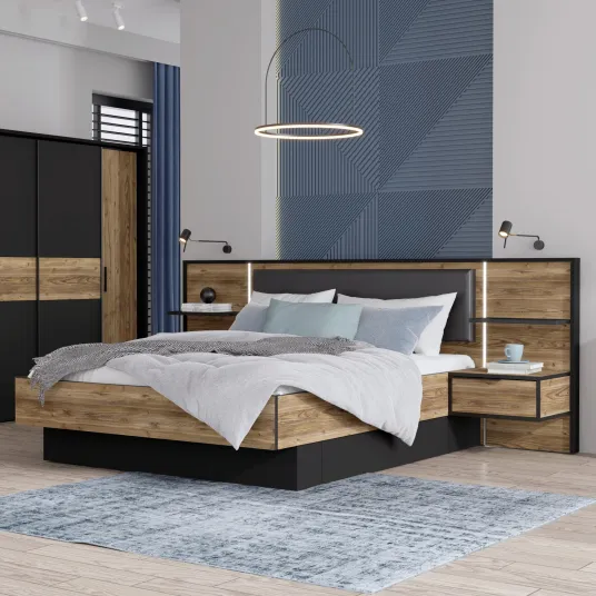 Pat cu noptiere Forte Jabim, dimensiuni 279.5 (160x 107.8)x 208.7 (200) cm, culoare pin/ negru mat, tapiterie piele ecologica neagra, manere metalice, cu ledPat cu noptiere Forte Jabim, dimensiuni 279.5 (160x 107.8)x 208.7 (200) cm, culoare pin/ negru mat, tapiterie piele ecologica neagra, manere metalice, cu led701883849701883849