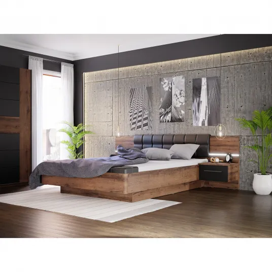 Pat cu noptiere Forte Recover, dimensiuni 265.8 (160)x 90x 235 (200) cm, culoare stejar pamantiu/ stejar negru, cu lada, tapiterie piele ecologica neagra, cu led