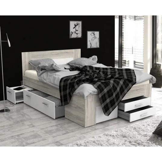 Patul modern si elegant din colectia Udine va oferi dormitorului o atmosfera unica. Un aspect practic al acestui model il reprezinta sertarele, care va permit sa depozitati asternuturi si alte materiale textile, dar si cele doua noptiere functionale, care se extrag. Combinatia dintre decorul natural, ce imita lemnul, cu insertii albe ii permit acestei piese de mobilier sa se potriveasca cu orice stil de dormitor. Noptierele sunt o solutie excelenta, in special in camerele mai mici, unde pot fi extrase si utilizate numai atunci cand este nevoie, oferind un spatiu practic, la indemana, pentru a depozita obiectele necesare. Manerele moderne, in culoarea aluminiului, subliniaza stilul elegant al compozitiei. Partea de sus a produsului completeaza perfect compozitia patului si intregul design interior. Necesita somiera cu rama si saltea cu dimensiunile 140x200cm. Fabricat din PAL de inalta calitate.