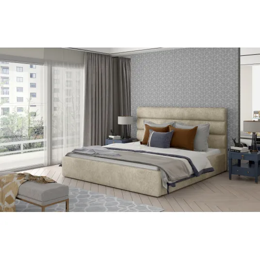 Pat dormitor Caramel 180x200 Cadru de lemn, BejCaramelul este un pat elegant, gustos si foarte confortabil intr-un stil clasic, care va fi complementul perfect al interiorului oricarui dormitor. Suprafata mobilierului poate fi aleasa in patru variante: 140/ 160/ 180/ 200 x 200 cm, ceea ce il face potrivit pentru orice dimensiune a camerei. Patul este disponibil atat cu cadru din lemn, cat si din metal. In acest din urma caz, castigam un recipient pentru asternut, precum si un lift de gaz pentru a facilita odihna de zi cu zi. O gama larga de culori va permite sa adaptati patul la decorul dormitorului. Dimensiunea eleganta a mobilierului este, de asemenea, influentata de capul inalt, care, decorat cu cusaturi, devine un element care confera intregii structuri o doza mare de eleganta. Caramelul este combinatia perfecta de confort maxim si design interesant. Nu conteaza daca aveti un dormitor in stil clasic sau modern - Caramel este patul perfect peste tot si intotdeauna.223582489223582489