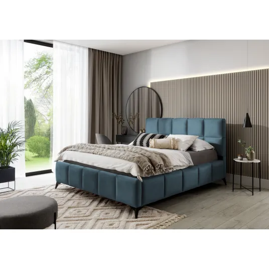 Pat dormitor Pat Mist 140x200, AlbastruPatul Mist este o combinatie de design modern si stil glamour, care aduce o Nuta de eleganta oricarui dormitor. Tetiera are o umplutura moale din spuma acoperita cu tapiterie de inalta calitate. Matlasarea care impodobeste patul Mist adauga stil si caracter, precum si aduce o Nuta de modernitate. Mobilierul este disponibil in trei latimi ale suprafetei de dormit: 140, 160, 180 x 200 centimetri. Acest lucru faciliteaza ajustarea patului la conditiile din apartament. Picioarele negre, din otel, cu o lungime de pana la 13,5 centimetri, fac ca patul sa para sa pluteasca deasupra solului, ceea ce mareste optic camera in care va fi plasat patul de ceata. In plus, mobilierul este, de asemenea, echipat cu un container de asternut, care este o solutie foarte buna pentru spatii mici si va permite sa va pastrati dormitorul ordonat.223581532223581532