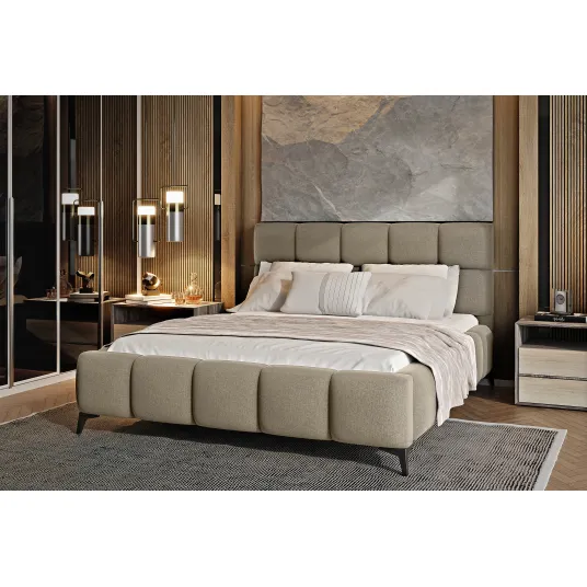Pat dormitor Pat Mist 160x200, BejPatul Mist este o combinatie de design modern si stil glamour, care aduce o Nuta de eleganta oricarui dormitor. Tetiera are o umplutura moale din spuma acoperita cu tapiterie de inalta calitate. Matlasarea care impodobeste patul Mist adauga stil si caracter, precum si aduce o Nuta de modernitate. Mobilierul este disponibil in trei latimi ale suprafetei de dormit: 140, 160, 180 x 200 centimetri. Acest lucru faciliteaza ajustarea patului la conditiile din apartament. Picioarele negre, din otel, cu o lungime de pana la 13,5 centimetri, fac ca patul sa para sa pluteasca deasupra solului, ceea ce mareste optic camera in care va fi plasat patul de ceata. In plus, mobilierul este, de asemenea, echipat cu un container de asternut, care este o solutie foarte buna pentru spatii mici si va permite sa va pastrati dormitorul ordonat.223581554223581554