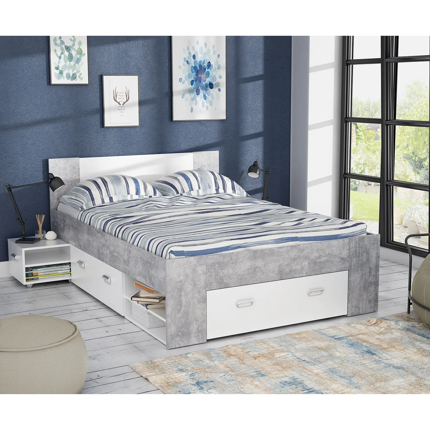 Pat Forte Bob, dimensiuni min:203.6x86x143.4 cm, saltea potrivita 140x200 cm, culoare beton optic gri deschis/ alb, noptiere retractabile, cu sertare